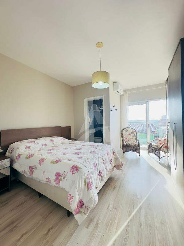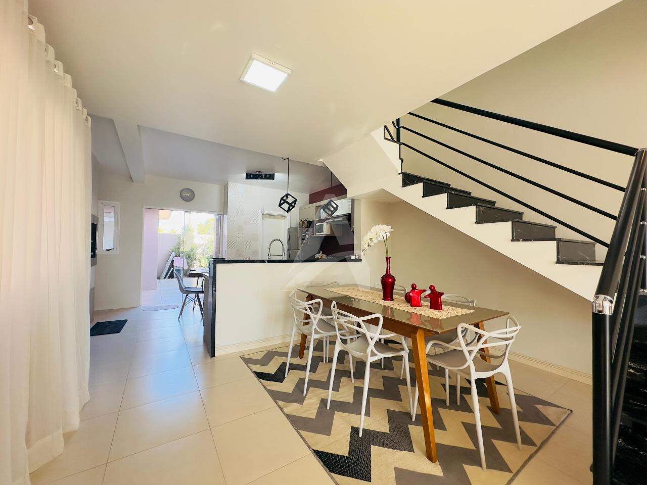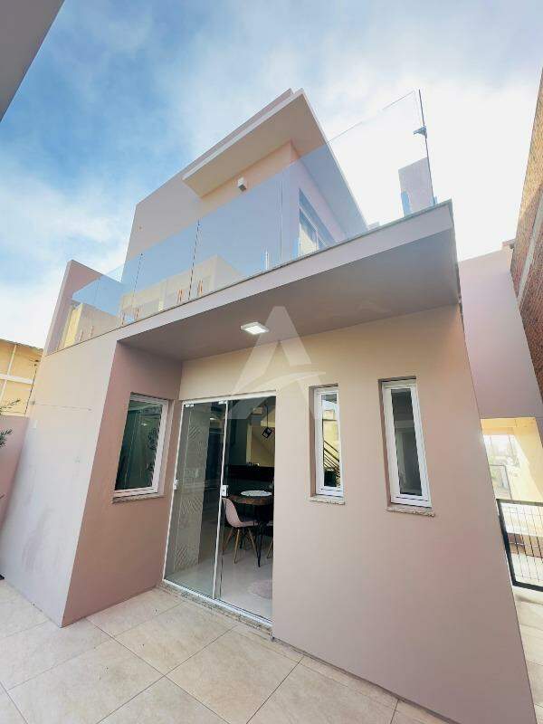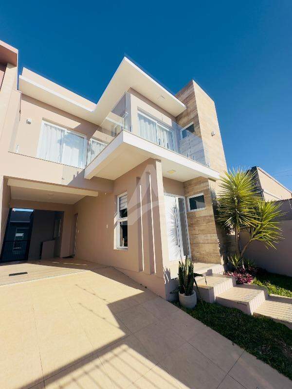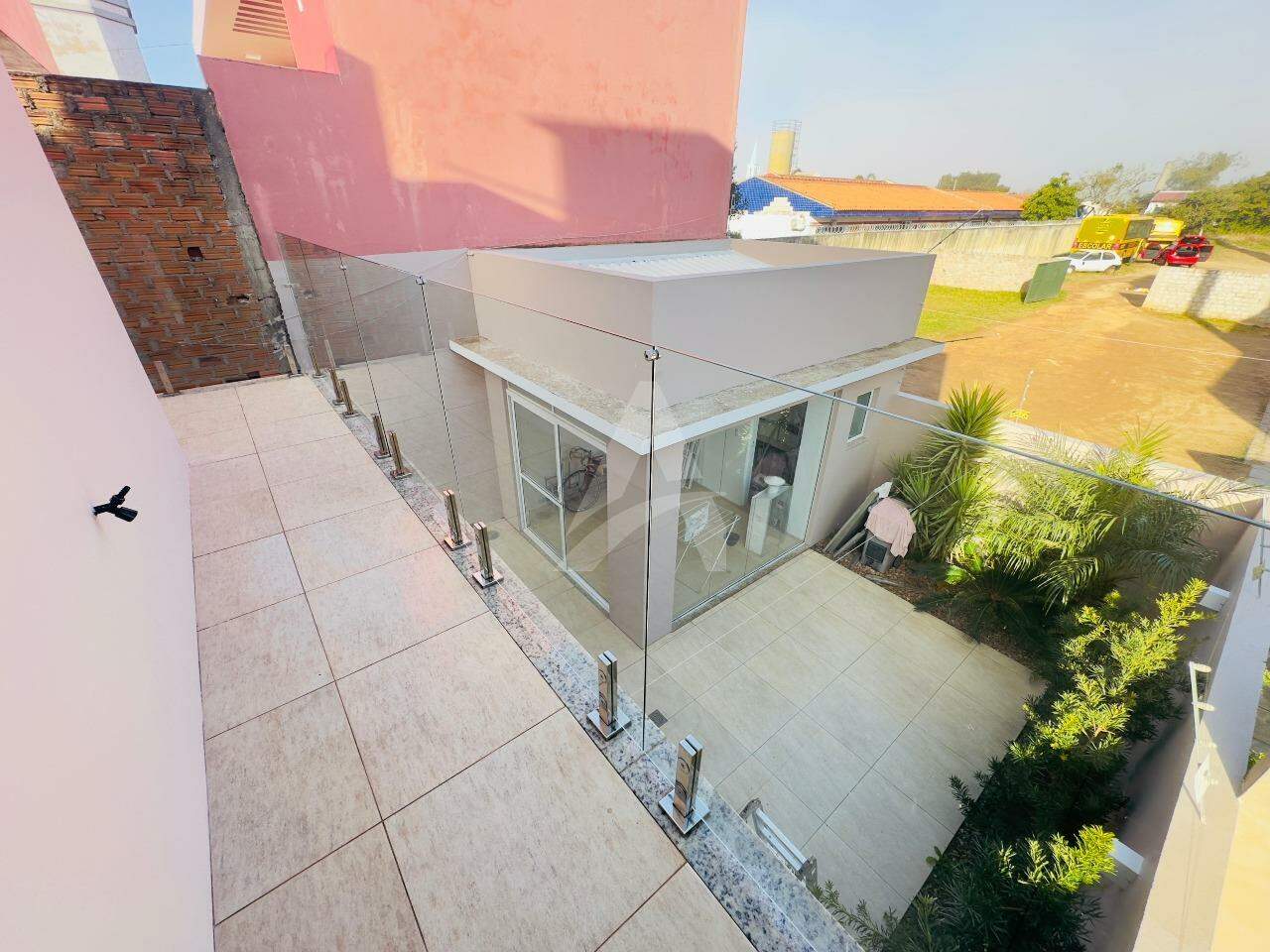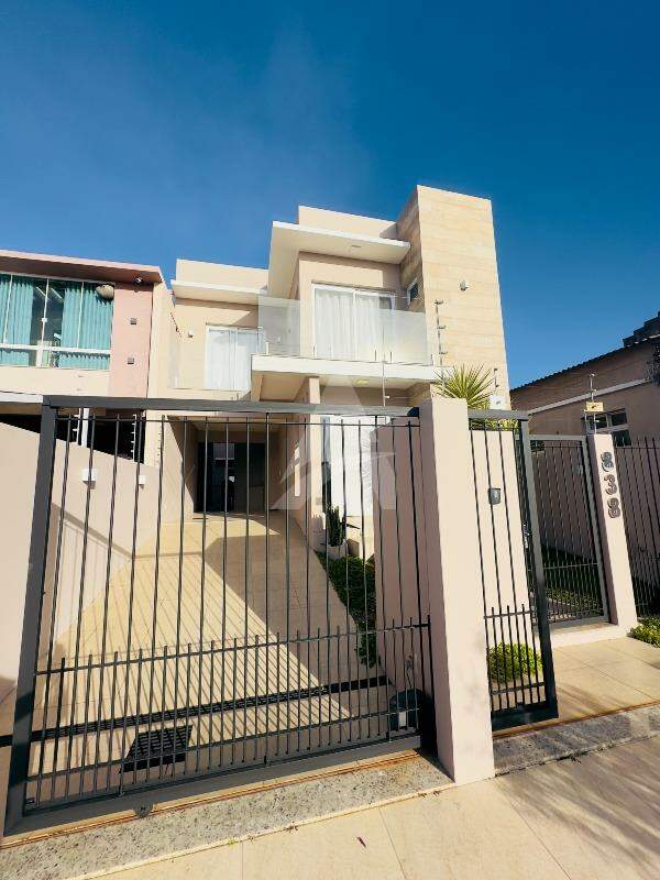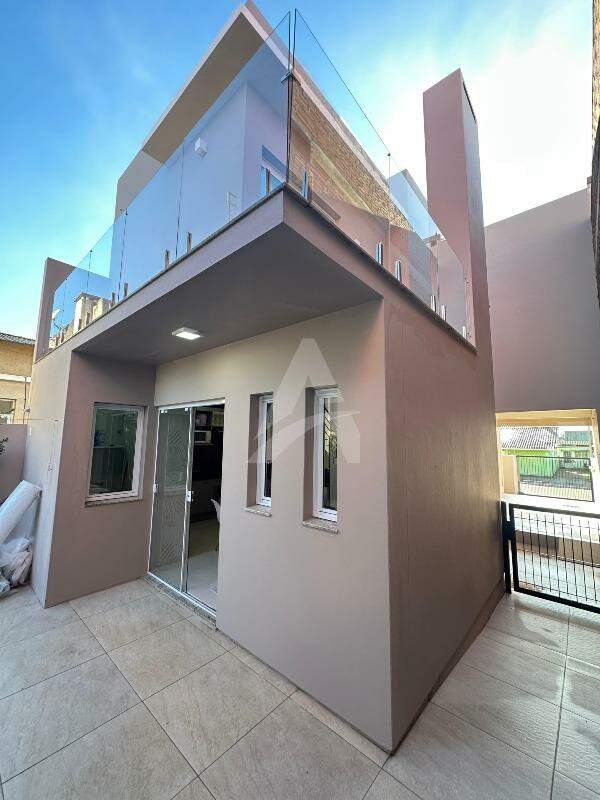 Sobrado Moderno, frente norte a Rua Santo Antônio com 143m2 de área construída, contendo uma sala, sala de jantar e cozinha sob medida integrada, churrasqueira rotativa em inox, fogão a lenha, lavabo, lavanderia, escada em mármore e corrimão em alumínio preto, parte superior conta com 01 suíte com sacada e guarda corpo em vidro temperado, 02 dormitórios com sacada individual, banheiro com box de vidro temperado e armário, ar condicionados, também possui um abrigo para carro, jardim portão eletrônico, alarme, cerca elétrica e um anexo com 14,85m2. Obs: Vários itens ficam na residência.