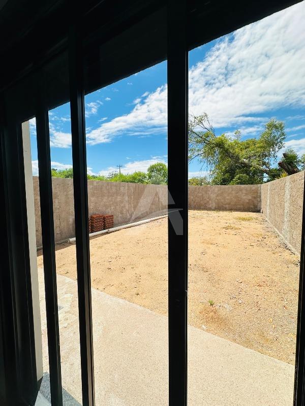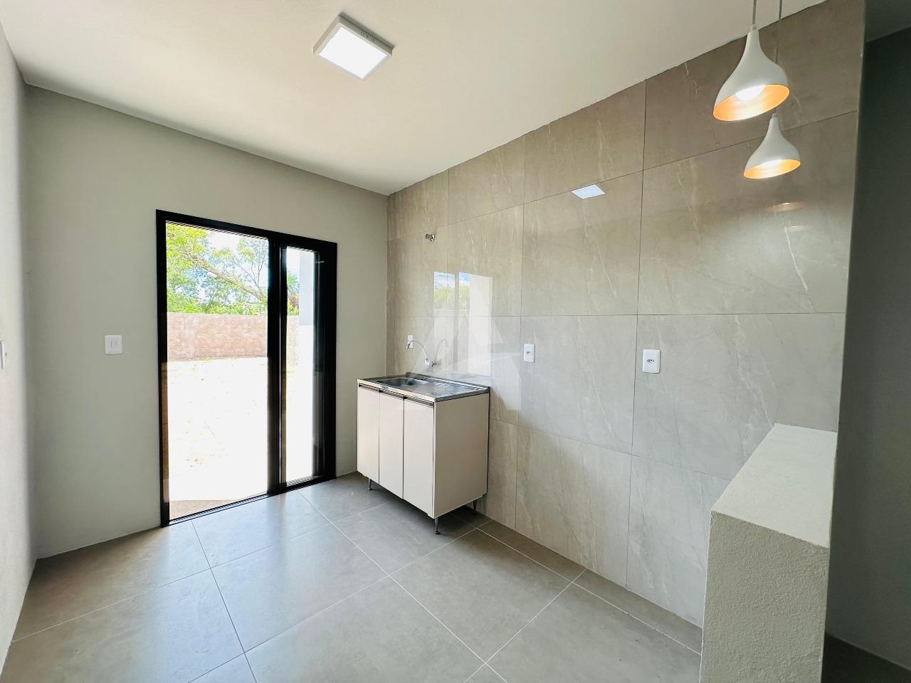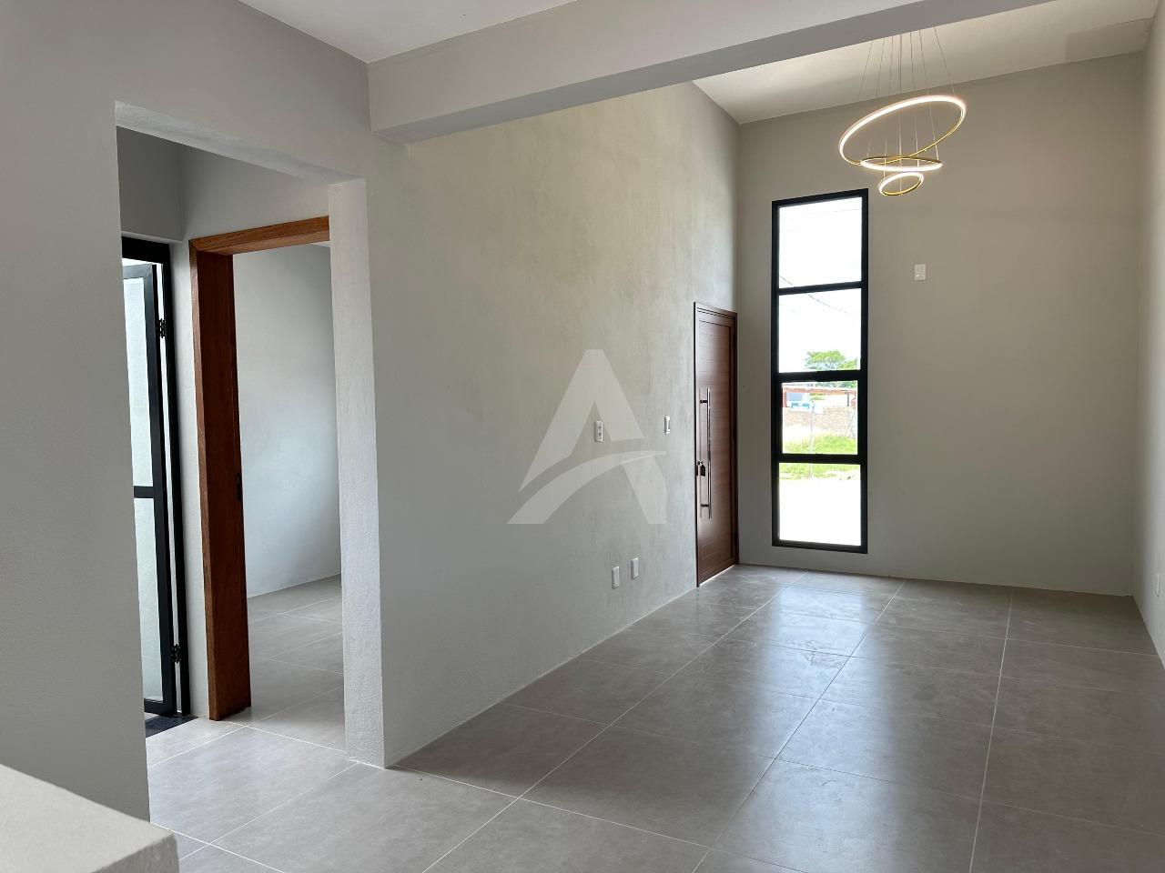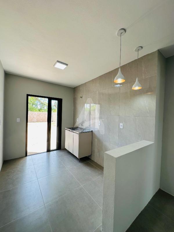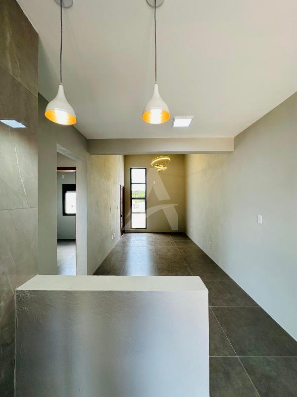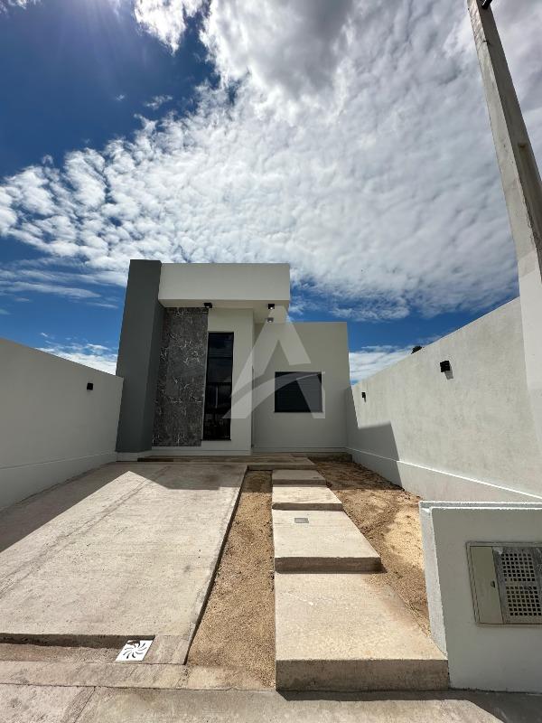 Casa de alvenaria e laje com 64 m², Moderna , contendo 02 dormitórios, sala de estar com espera para lareira e com pé direito alto e um lindo lustre , cozinha em conceito aberto, 01 banheiro, espera para churrasqueira e pátio amplo e todo murado. Terreno 6 x 30 , frente norte no loteamento fazenda do Sobrado. Apta à financiamento.