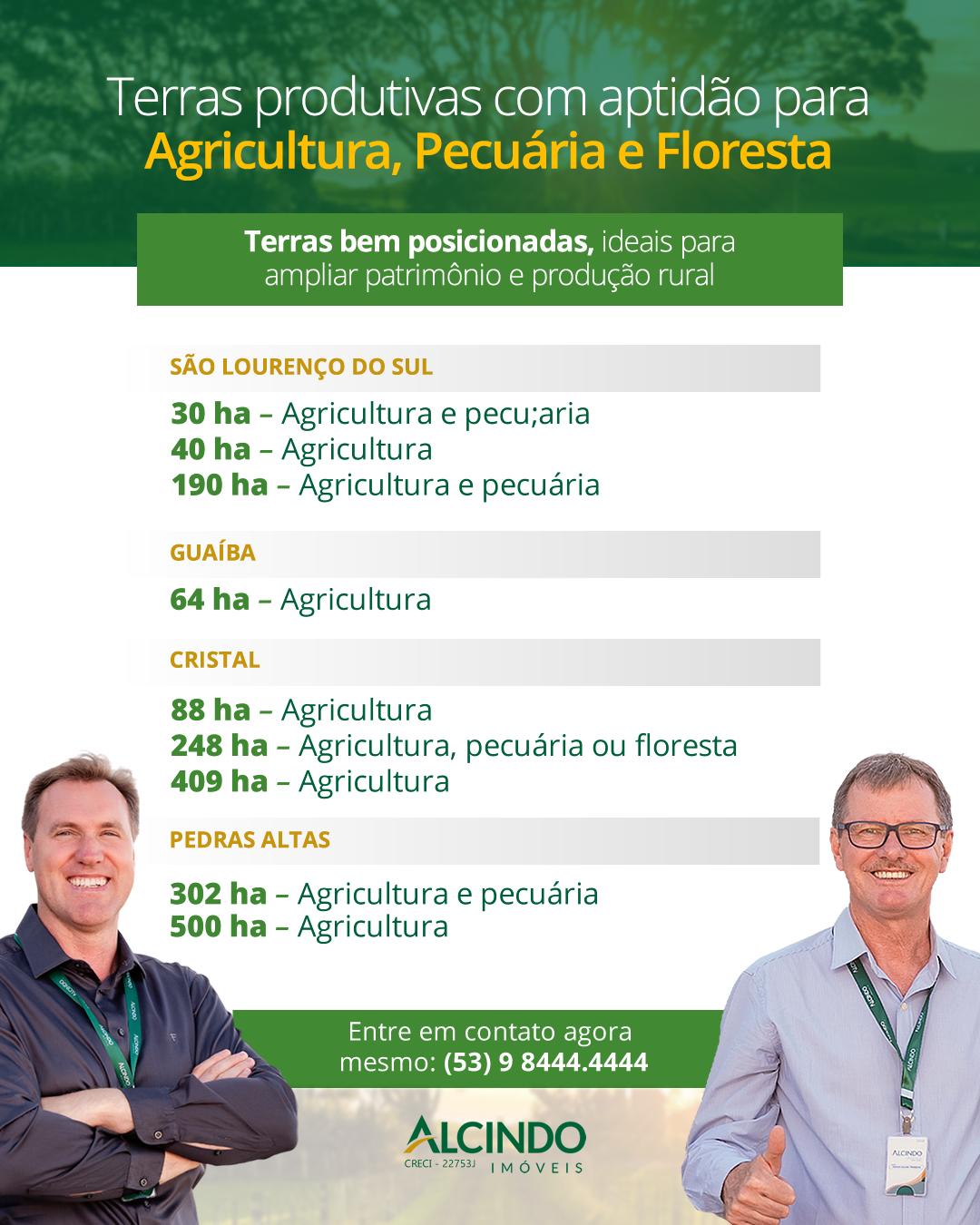 Na Imobiliária Alcindo Imóveis, trabalhamos com áreas rurais altamente produtivas em São Lourenço do Sul, conhecendo de perto a realidade do produtor e o potencial de valorização de cada região do município. Estaremos presentes na Festa do Fumo, reforçando nosso compromisso com o interior e com quem acredita na força da terra. Se você pensa em comprar, vender ou investir em área rural, esse é o momento ideal para conversar e conhecer as oportunidades disponíveis, como: