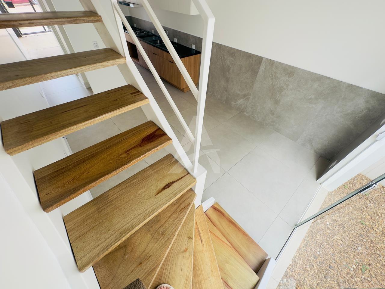 Sobrado em alvenaria, paredes duplas , com 103,39m² de área construída, contendo 03 dormitórios (sendo 01 suíte) com piso vinilico, sala e cozinha conjugada ( com móveis sob medida na cozinha), com tampo de granito com misturador monocomando, banheiro com tampo em granito/mármore, lavabo, área coberta para automóvel com churrasqueira (com suporte), sacadas, Esquadrias com vidros temperados e brises deslizantes em madeira Garopeira, pintura Cetol, todas as portas com amortecimento em borracha, toda iluminação em placas de led e dicroicas em led pontuais, tubulação para agua quente, escada em metal, com degraus em madeira, permitindo ventilação. Uma casa diferenciada, elegante e aconchegante, funcional, dentro de uma proposta moderna e inovadora.