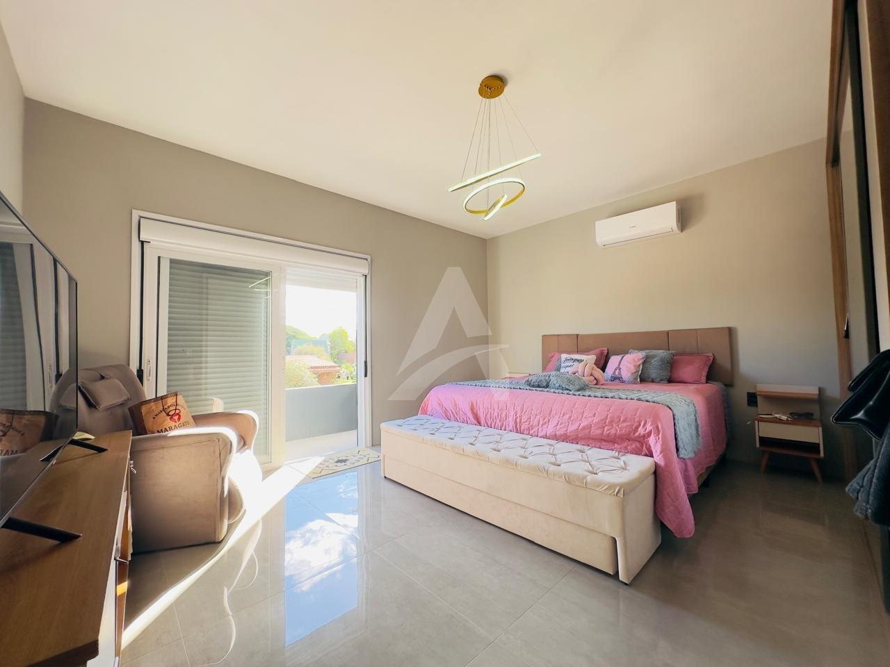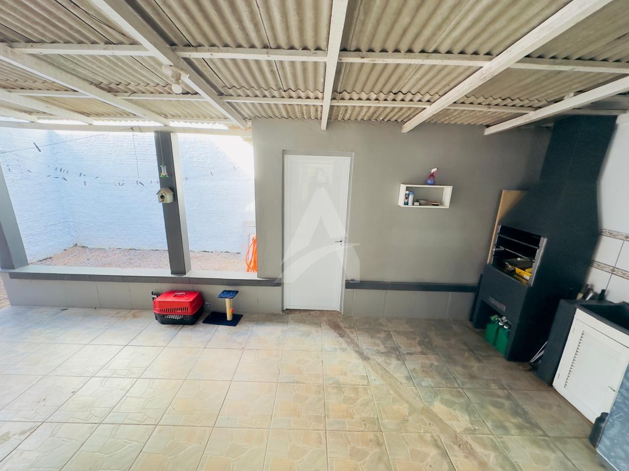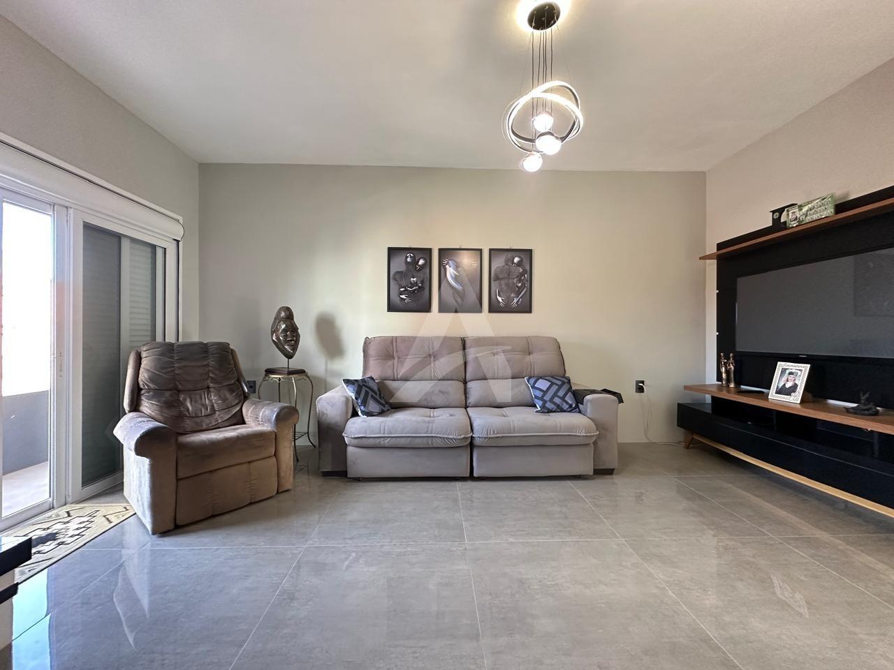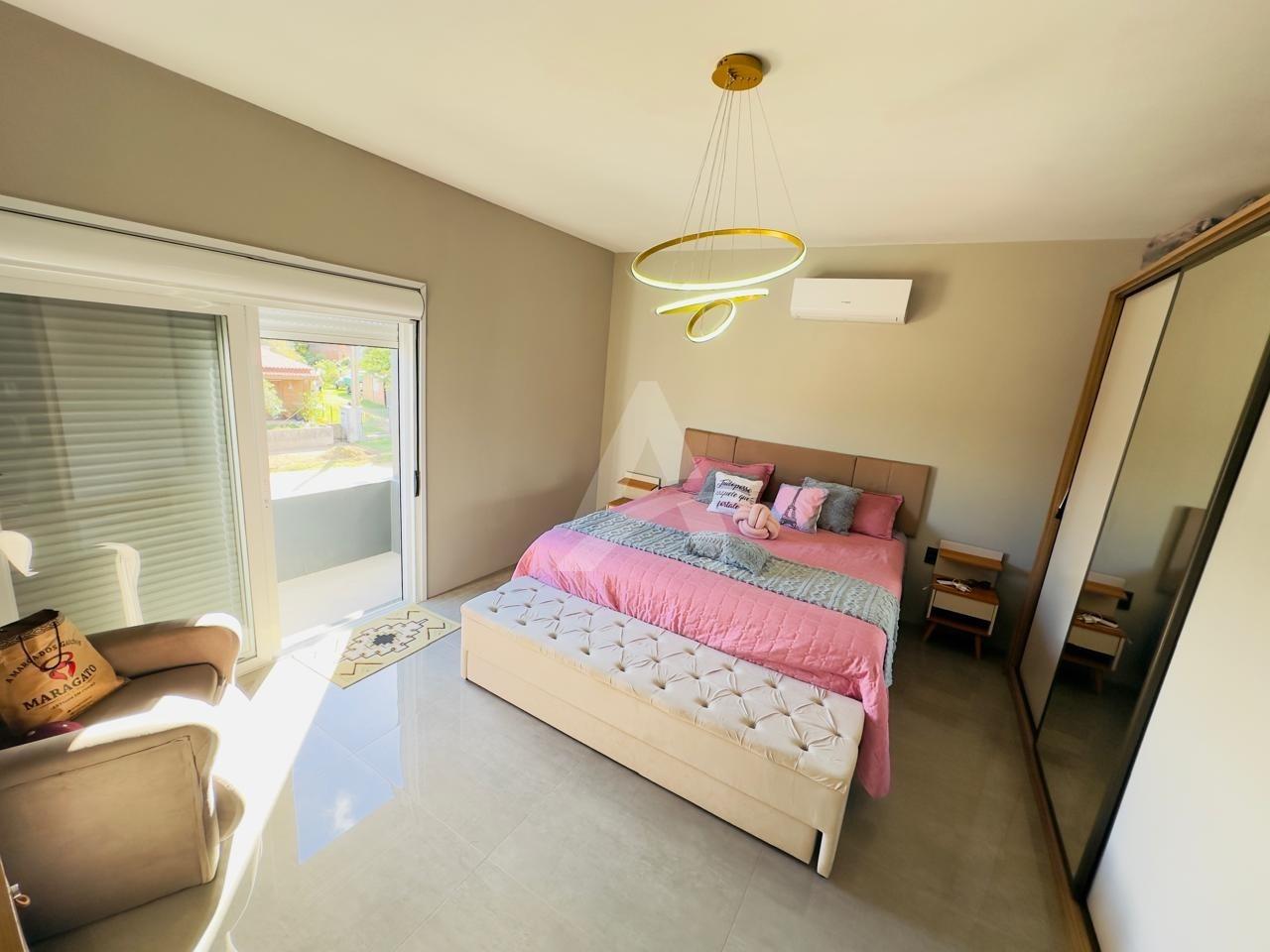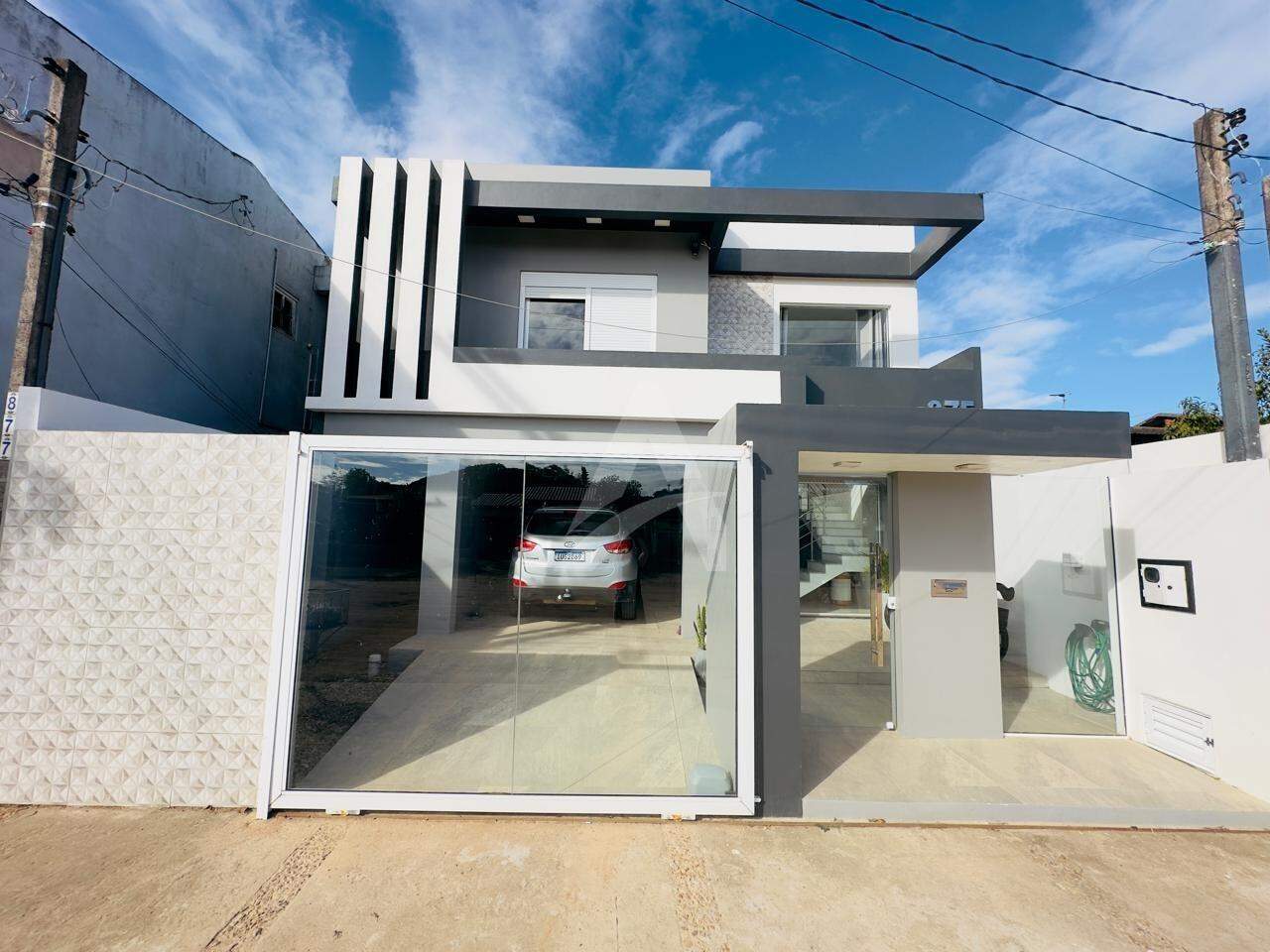 Sobrado em alvenaria com 122,00m², contendo no térreo hall de entrada, sala de estar, cozinha, 01 dormitório, 01 banheiro, espaço gourmet com churrasqueira, garagem e lavanderia. E, no primeiro pavimento contém 01 suíte, 01 dormitório, sala de estar com lareira, e, sacada nos fundos e na frente. Terreno com área de 170,00m², medindo 8,50 x 20,00 metros. Frente Oeste.